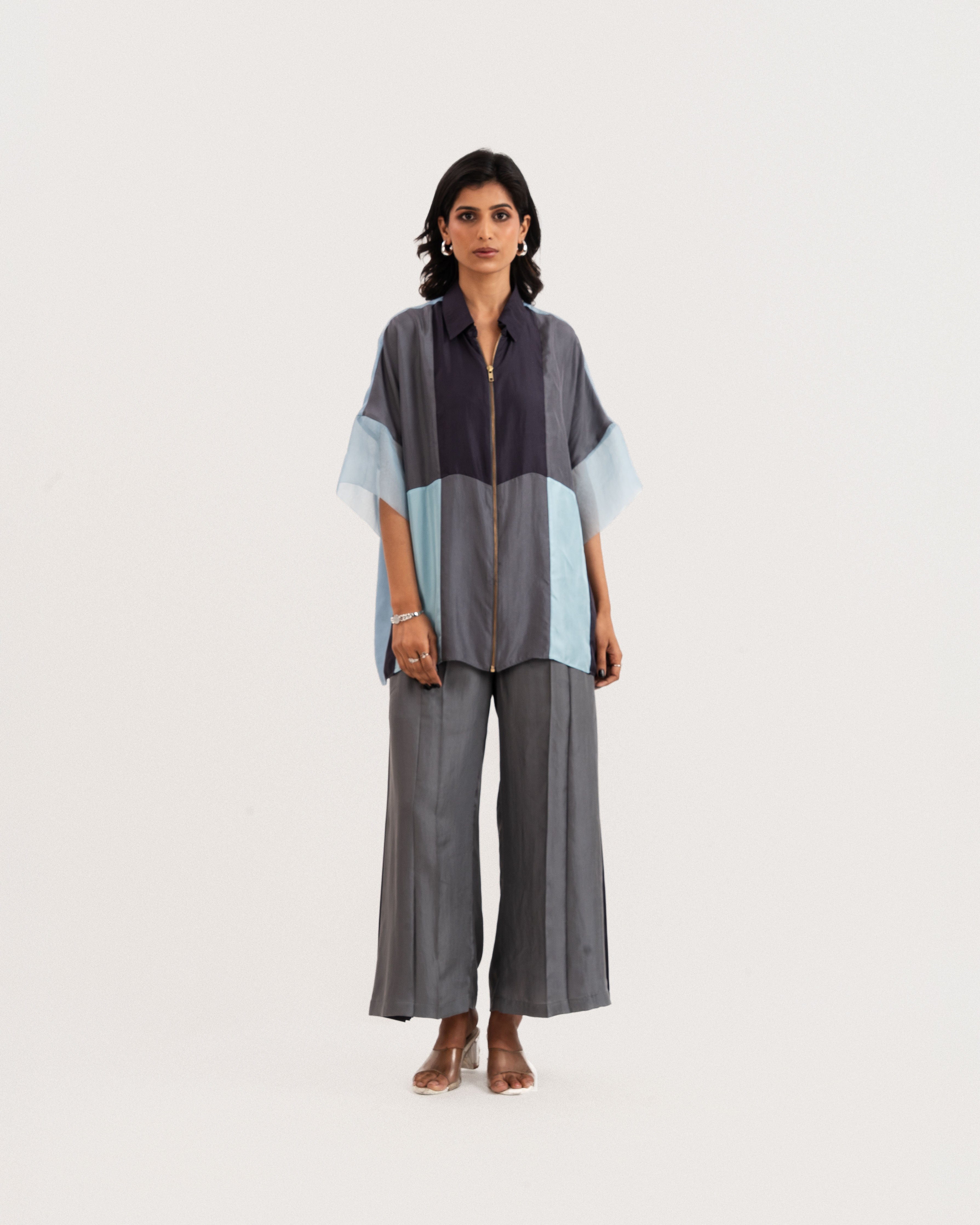 Hairaito is a Japanese term which freely translates into "To Highlight". Hairaito is an amalgamation of the label's patent embroidery patterns and cuts that are emphasized by strong highlights. Flow and Form have always been the root of Divya Jain's design process. Breathable cottons have been selected in summer tones of Olive Greens, Azures and Navy Blues that transition into frosty whites. These colors borrow inspiration from nature, particularly forests and oceans, not just in their dappled hues but the form and flow philosophy as well. Flowy open jackets in flowing Chanderi to T-shirt dresses and co-ords sets in embellishes as well as striped cottons create a range that has something to suit everyone.