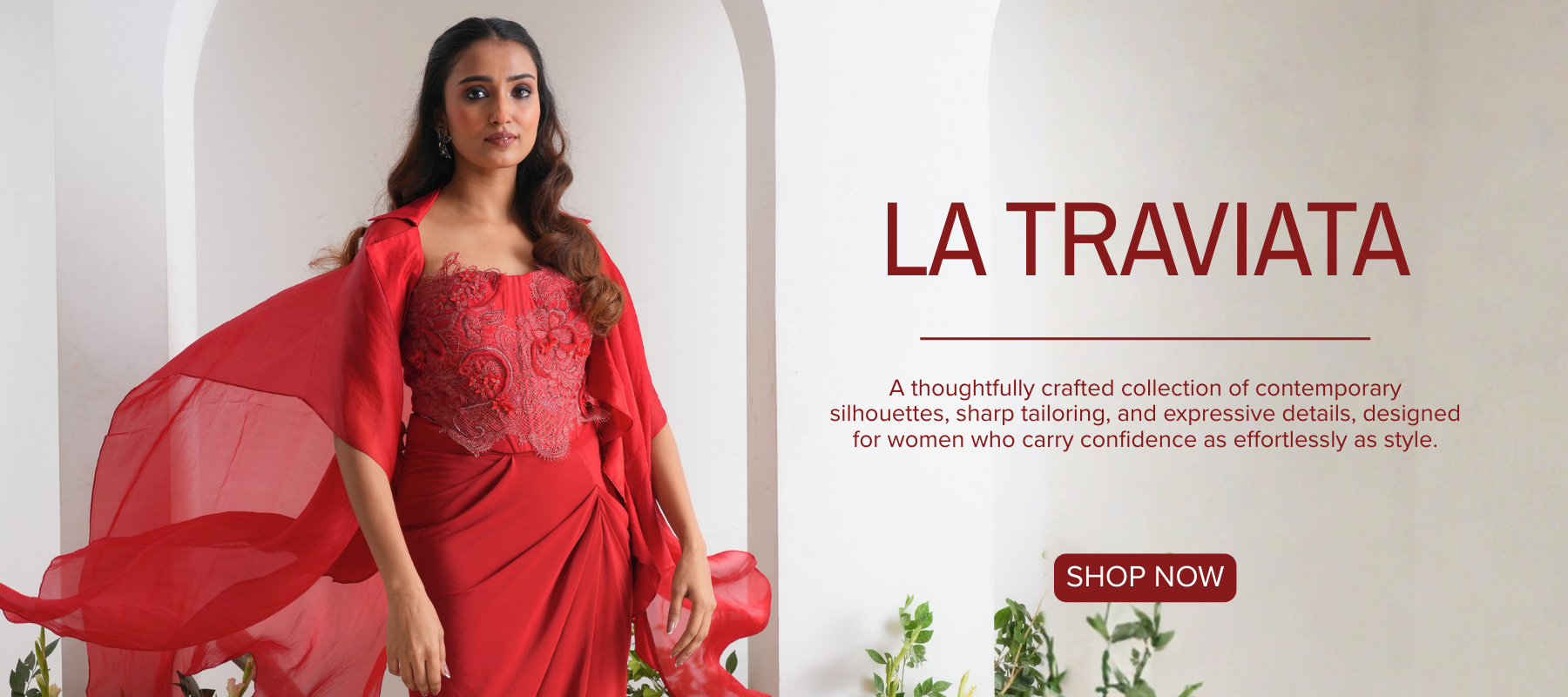 A collection inspired by timeless romance, where every silhouette sings of passion and poise. La Traviata captures the essence of a woman who loves fearlessly, carries grace effortlessly, and turns every fleeting moment into an eternal memory.
